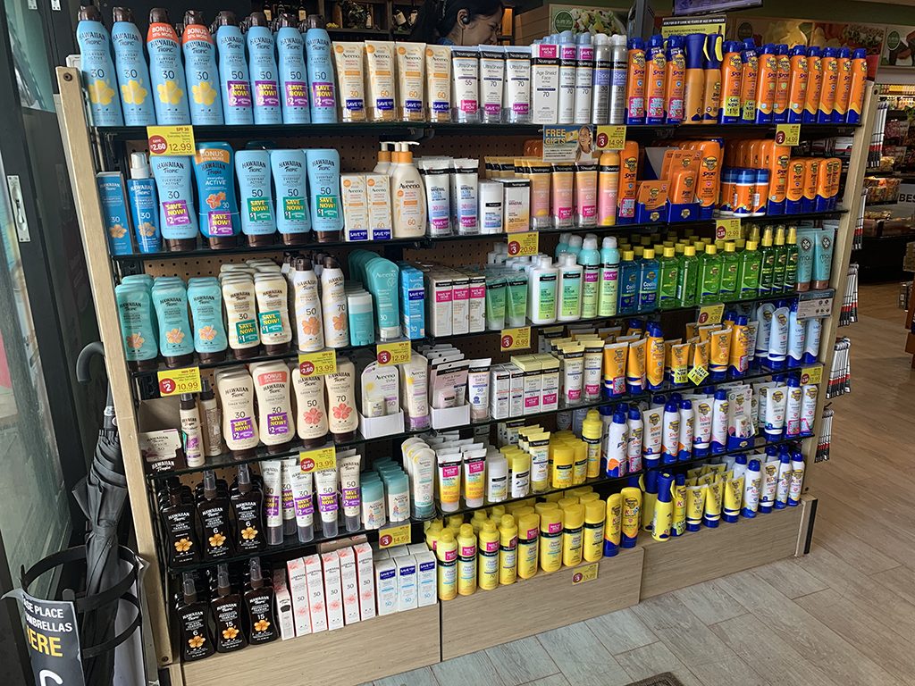 Almost all the sunscreens available in Guam are displayed here.