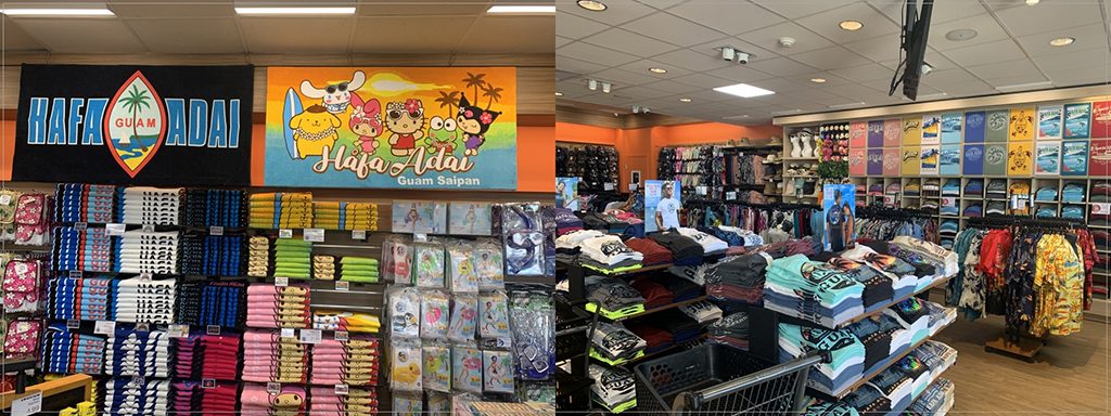 There are many Guam logo T-shirts, Hawaiian shirts, and large towels displayed.