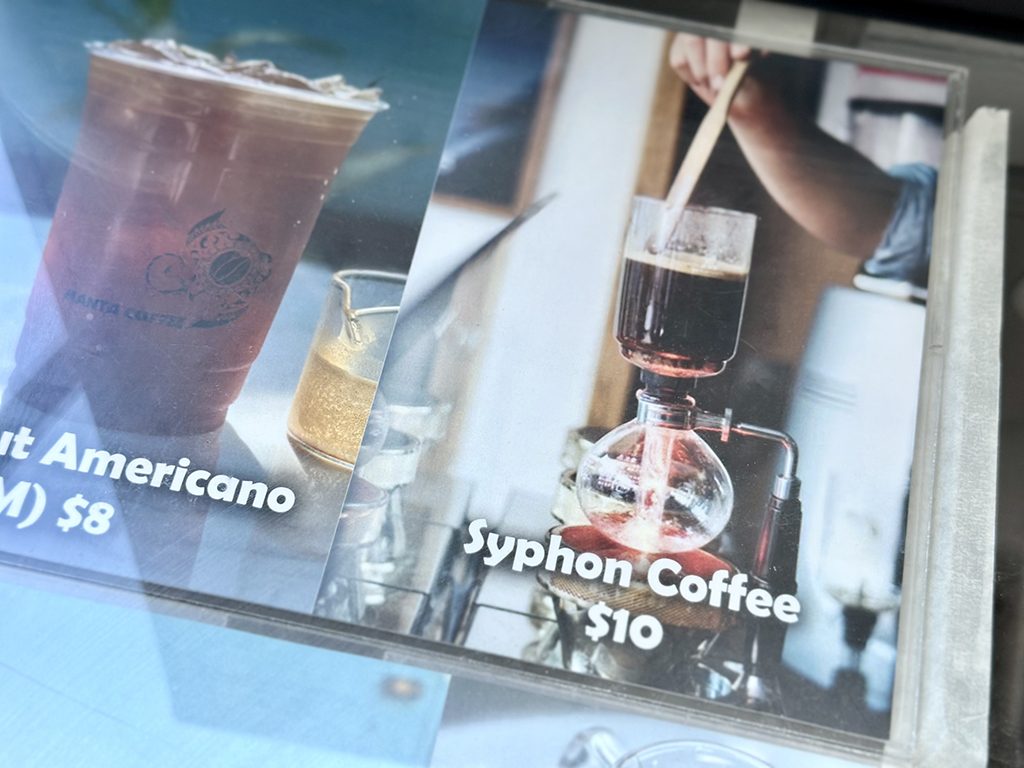 The menu features drip coffee and siphon coffee, carefully brewed by the owner, along with various gourmet coffee options.