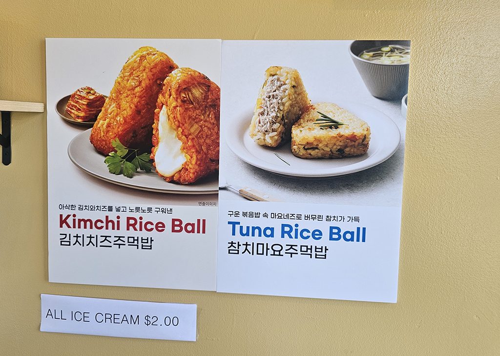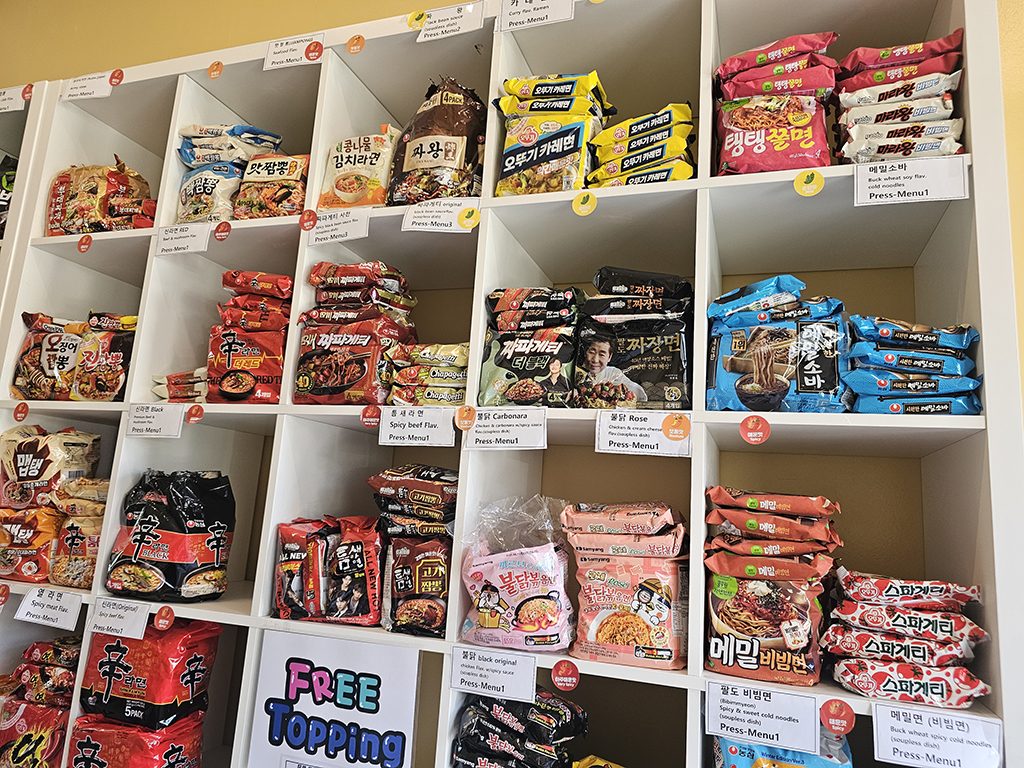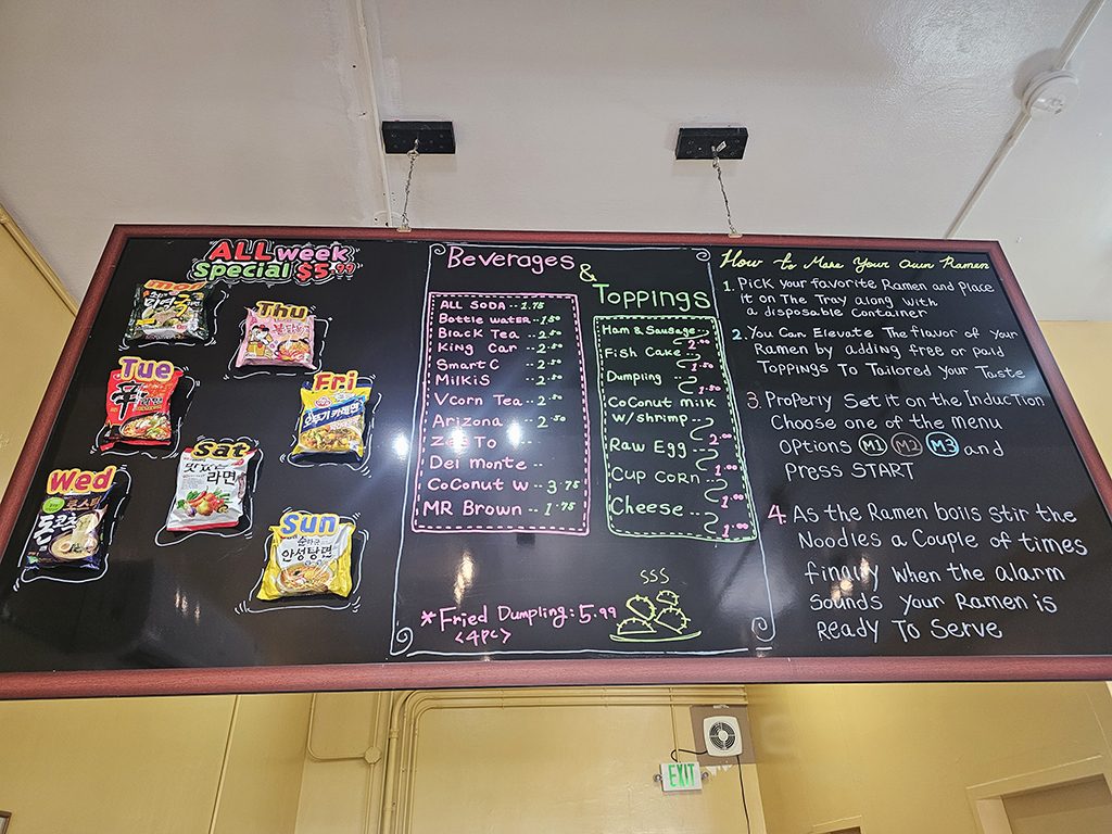 계산대 위의 디스플레이도 꼭 확인하세요! 일반 라면은 7.99달러이지만, 주간 특별 라면을 선택하면 5.99달러로 저렴하게 드실 수 있습니다. 추천 토핑과 조리법(영어로만 제공) 등 K라면 정보가 가득하니 놓치지 마세요.