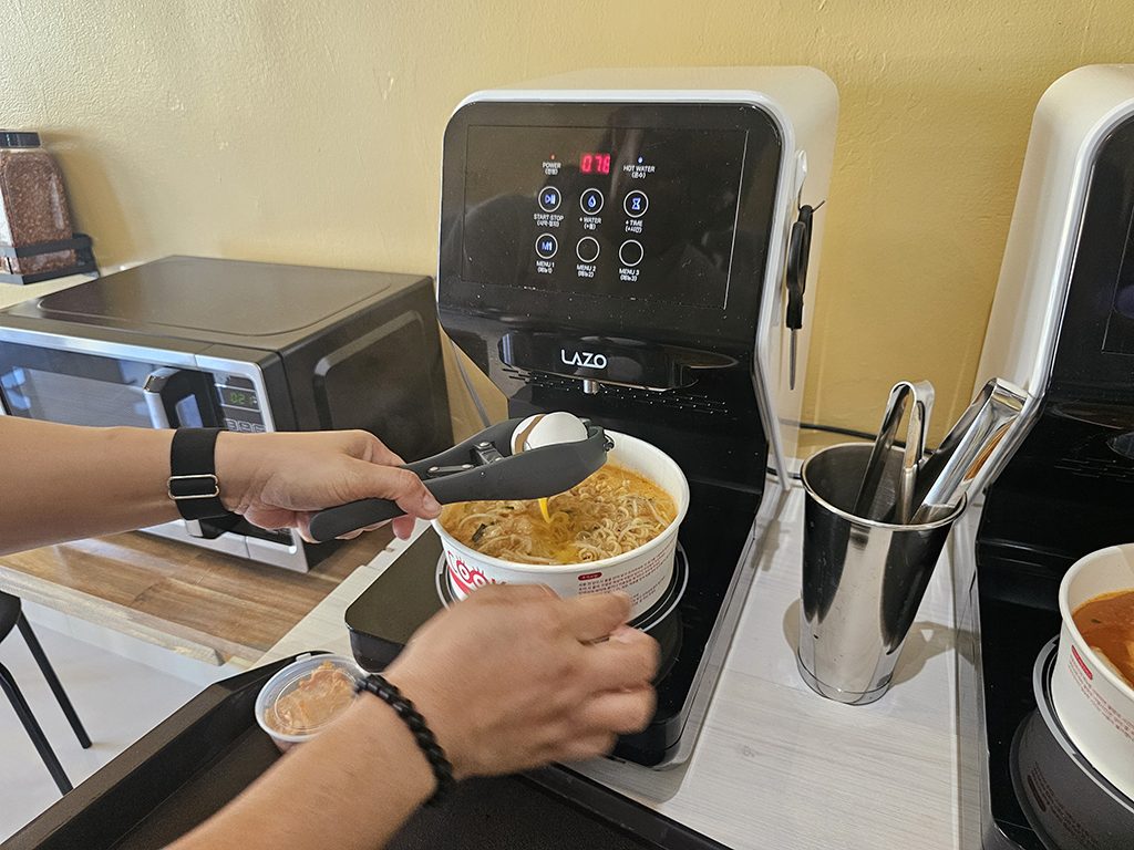 라면을 만드는 과정 자체가 하나의 엔터테인먼트입니다! 조리기 안에서 보글보글 끓는 라면을 보면 식욕이 절로 돋습니다. 가장 인기 있는 추가 토핑은 날계란인데, 전용 집게를 사용하면 완벽하게 깨뜨릴 수 있습니다. 치즈, 스팸, 참치 등 다른 토핑도 있으므로 자신만의 오리지널 라면을 만들어 보는 것을 적극 추천합니다. 면을 섞고 자신만의 특별한 라면을 만드는 과정을 즐겨보세요!